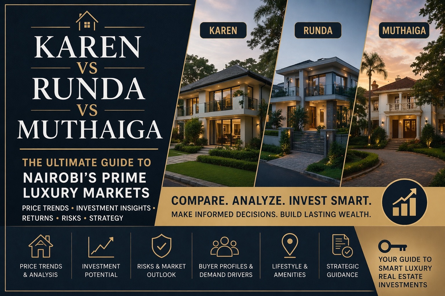 🏡 Karen vs Runda vs Muthaiga: A Decision Guide to Nairobi’s Prime Luxury Real Estate Markets (2026) A professional comparison of Karen, Runda, and Muthaiga property markets. Analyze pricing, trends, risk, and investment potential to make informed luxury real estate decisions in Nairobi. Understanding Nairobi’s Prime Residential Markets Nairobi’s luxury real estate market is not uniform....